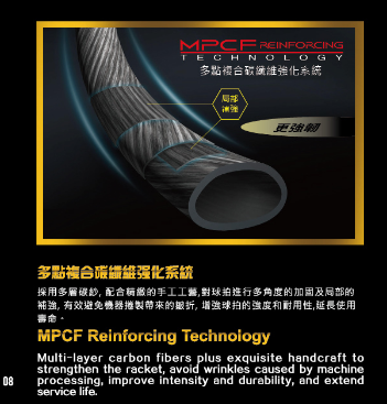 MPCF REINFORCING TECHNOLOGY: Gia cố carbon đa lớp đa điểm giúp tăng cường độ cứng cáp và tuổi thọ cho khung vợt dưới áp lực căng dây cao.