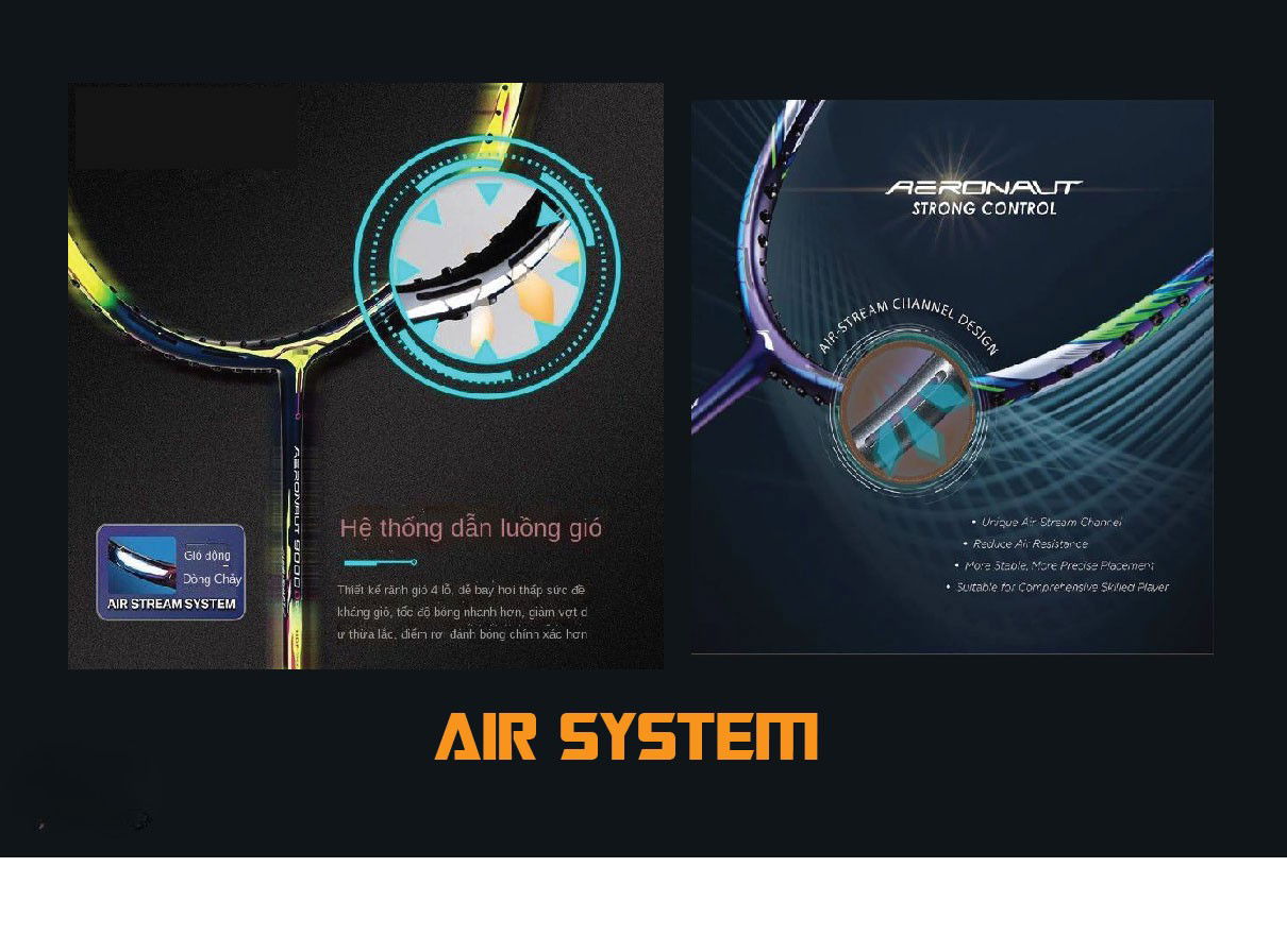 • AIR-STREAM SYSTEM: Công nghệ định danh của dòng vợt này với thiết kế 4 rãnh gió (lỗ thông khí) nằm ở góc 5 giờ và 7 giờ trên khung vợt. Luồng khí đi xuyên qua khung giúp giảm hệ số cản gió tới 8.2%, tăng tốc độ vung vợt và giảm sự mệt mỏi cho cổ tay người chơi.